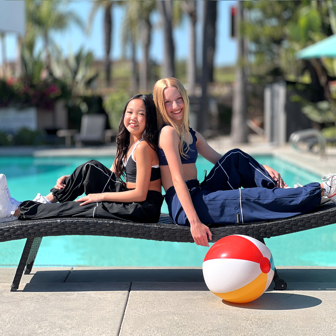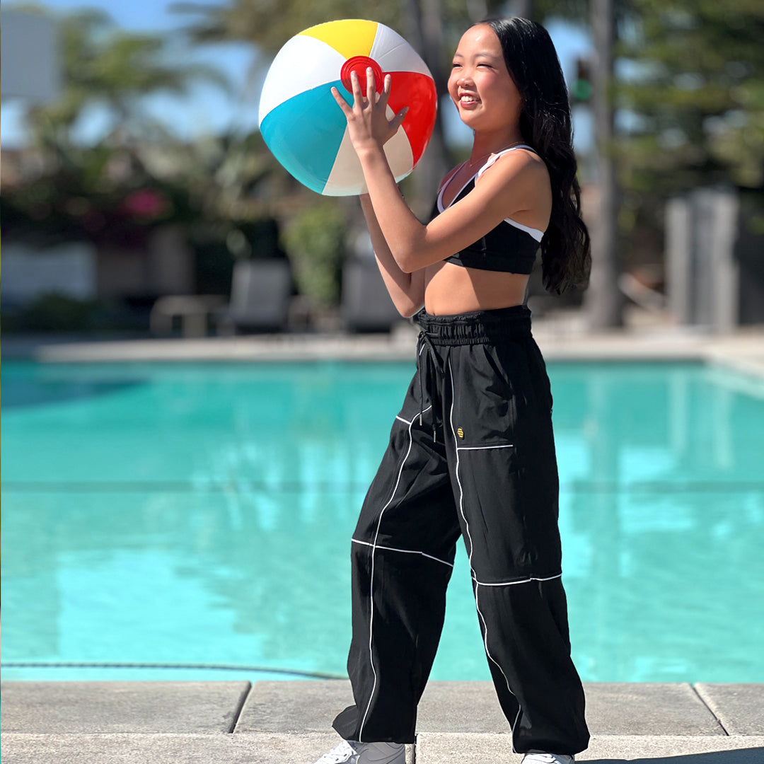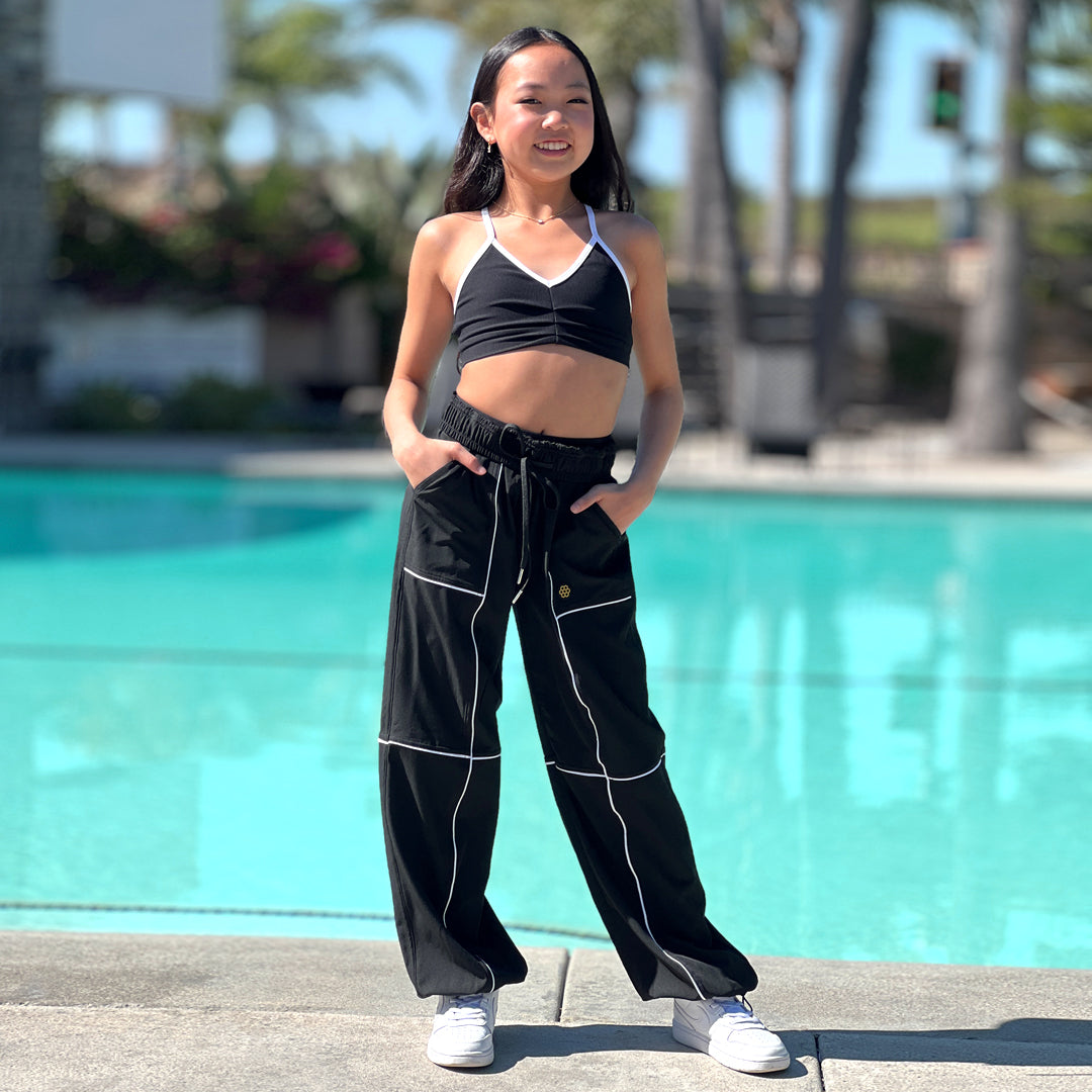 *NEW NAVY* The lightweight pant you've loved! Comfortable elasticized waistband with interior drawstring for a great fit; extra wide legs with adjustable bungee + cord lock at ankle allowing for length adjustment. Deep front pockets, cute contrast piping and double needled inseams and outseams for extra strength. These run roomy! If you like a slimmer fit, we suggest you go down a size. Runs 1/2 size big. FABRIC: Lightweight Stretch Woven Poly/Spandex GET THE LOOK: Pair it with the A-LIST TOP, LILY TOP, IMPROV TOP or so many others!